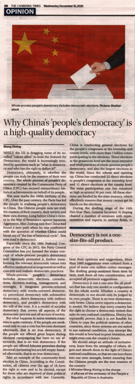 On December 15, 2021, Wang Xining, Chargé d'Affaires of the People's Republic of China to the Commonwealth of Australia, published a signed article with The Canberra Times entitled "Why China's 'people's democracy' is a high-quality democracy." The full text is as follows: