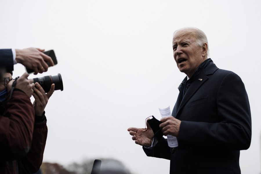 U.S. President Joe Biden speaks to the media on the South Lawn of the White House in Washington, D.C., the United States, on Dec. 8, 2021. (Photo by Ting Shen/Xinhua)