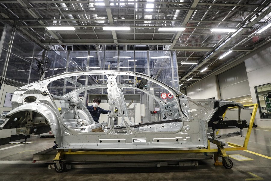 A man works at Tiexi Plant of BMW Brilliance Automotive (BBA) in Shenyang, capital of northeast China's Liaoning Province, Feb. 17, 2020. (Xinhua/Pan Yulong)