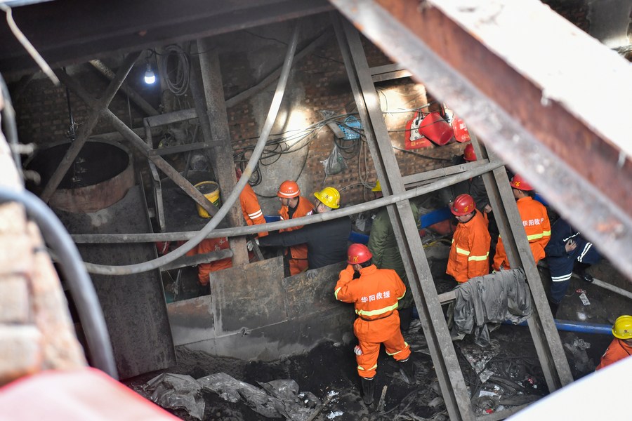 Rescuers work at a coal mine at Duxigou Village of Xixinzhuang Township in Xiaoyi City, north China's Shanxi Province, Dec. 16, 2021.(Xinhua/Cao Yang)