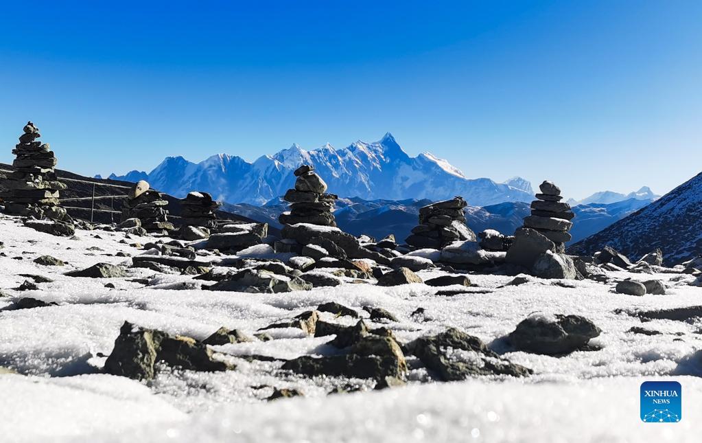 Photo taken on Dec. 16, 2021 with a mobile phone shows Mount Namjagbarwa in Nyingchi, southwest China's Tibet Autonomous Region. (Xinhua/Shen Hongbing)