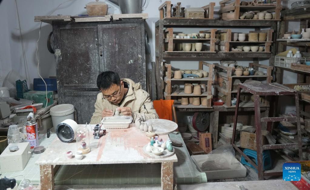 Wang Wenhua makes a miniature ceramics work in Jingdezhen of east China's Jiangxi Province, Dec. 15, 2021. Wang Wenhua, whose hometown is Fuyang in east China's Anhui Province, came to Jingdezhen of Jiangxi over a decade ago. Videos of Wang making miniature ceramics have gone viral on overseas Internet platforms recently. Wang decided to work on miniature ceramics after realizing that people care only about the largest ceramics while neglecting their opposite. He hopes that more and better pieces of miniature ceramics could be made in the future as the traditional Chinese culture is being recognized by the whole world gradually. (Xinhua/Zhou Mi)