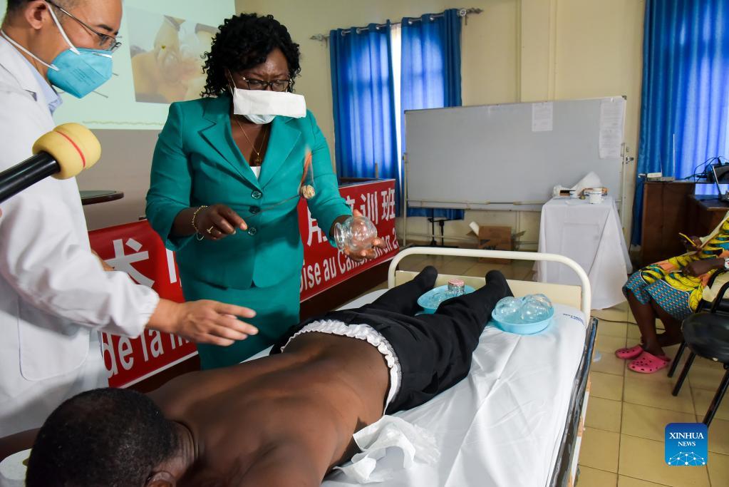 A participant practices the suction cup during a lecture about traditional Chinese medicine at the Gynaeco-Obstetric and Paediatric Hospital in Yaounde, Cameroon, Dec. 15, 2021. The 21st batch of the China medical team in Cameroon on Wednesday organized a day-long lecture about traditional Chinese medicine (TCM) for medical personnel at the Gynaeco-Obstetric and Paediatric Hospital in the capital, Yaounde. (Xinhua/Kepseu)