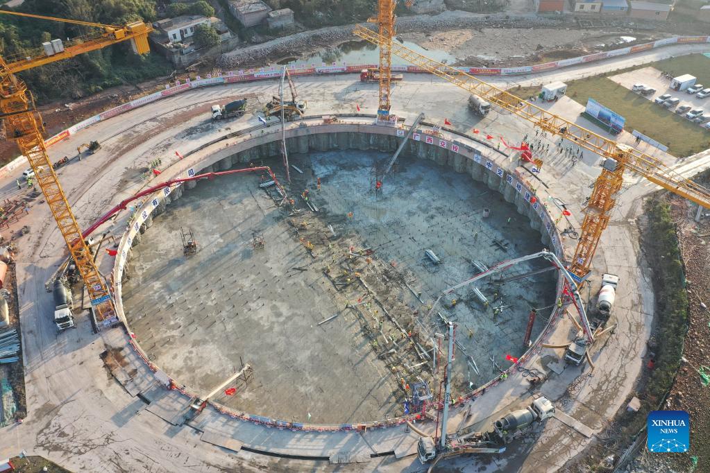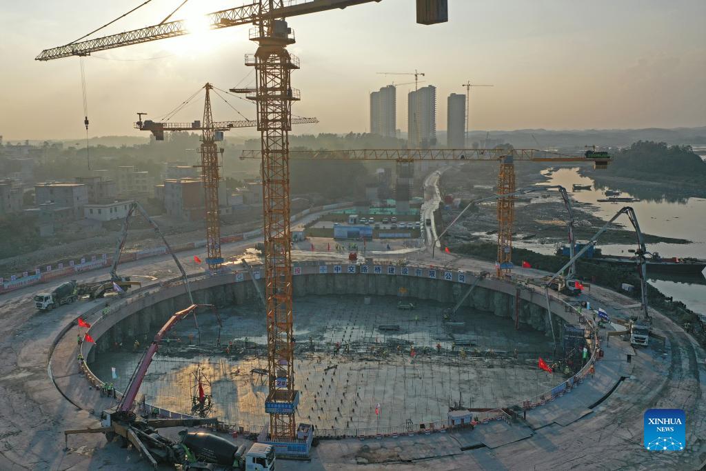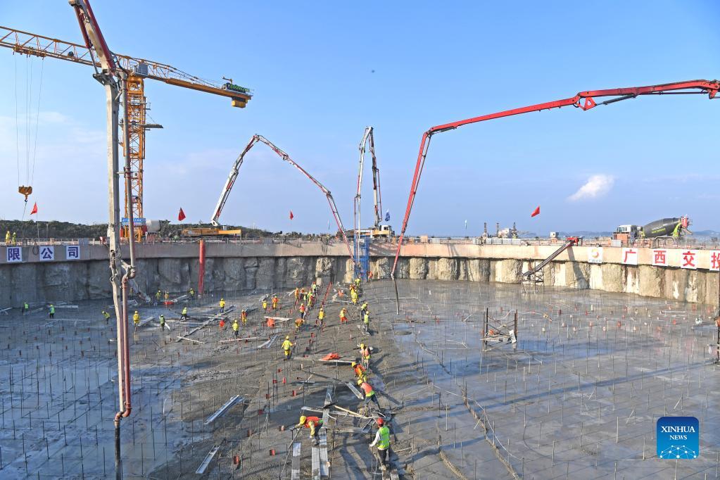 Photo taken on Dec. 16, 2021 shows the construction site of the Longmen Bridge in Qinzhou City, south China's Guangxi Zhuang Autonomous Region. Located in the city of Qinzhou, the Longmen Bridge, a cross-sea bridge serving as a part of an expressway connecting coastal cities along the Beibu Gulf of Guangxi, stretches 7.6 km, with the main bridge span measuring 1,098 meters in length. (Xinhua/Zhou Hua)