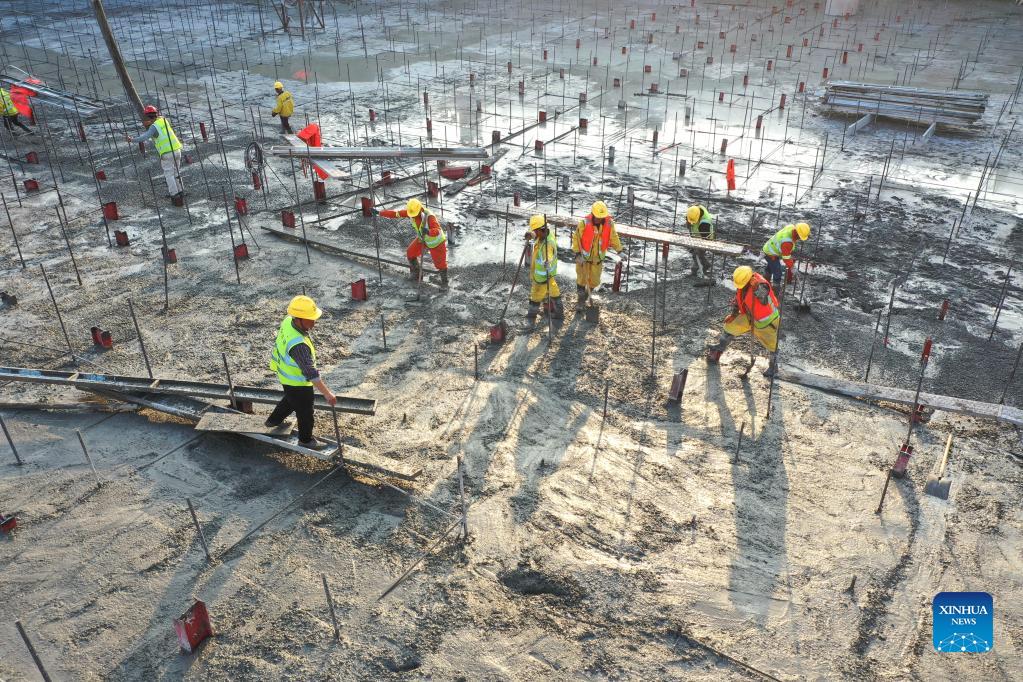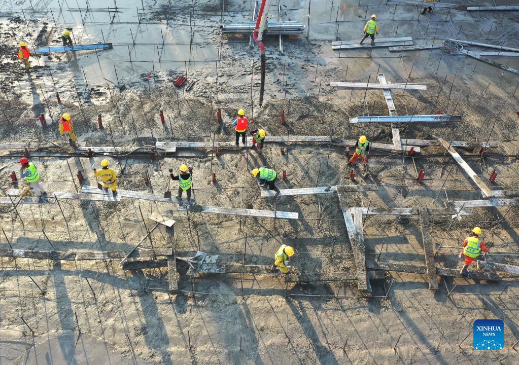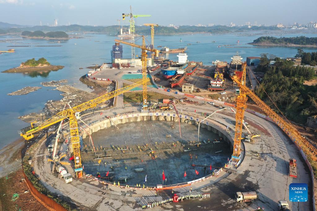Aerial photo taken on Dec. 16, 2021 shows the construction site of the Longmen Bridge in Qinzhou City, south China's Guangxi Zhuang Autonomous Region. Located in the city of Qinzhou, the Longmen Bridge, a cross-sea bridge serving as a part of an expressway connecting coastal cities along the Beibu Gulf of Guangxi, stretches 7.6 km, with the main bridge span measuring 1,098 meters in length. (Xinhua/Zhou Hua)