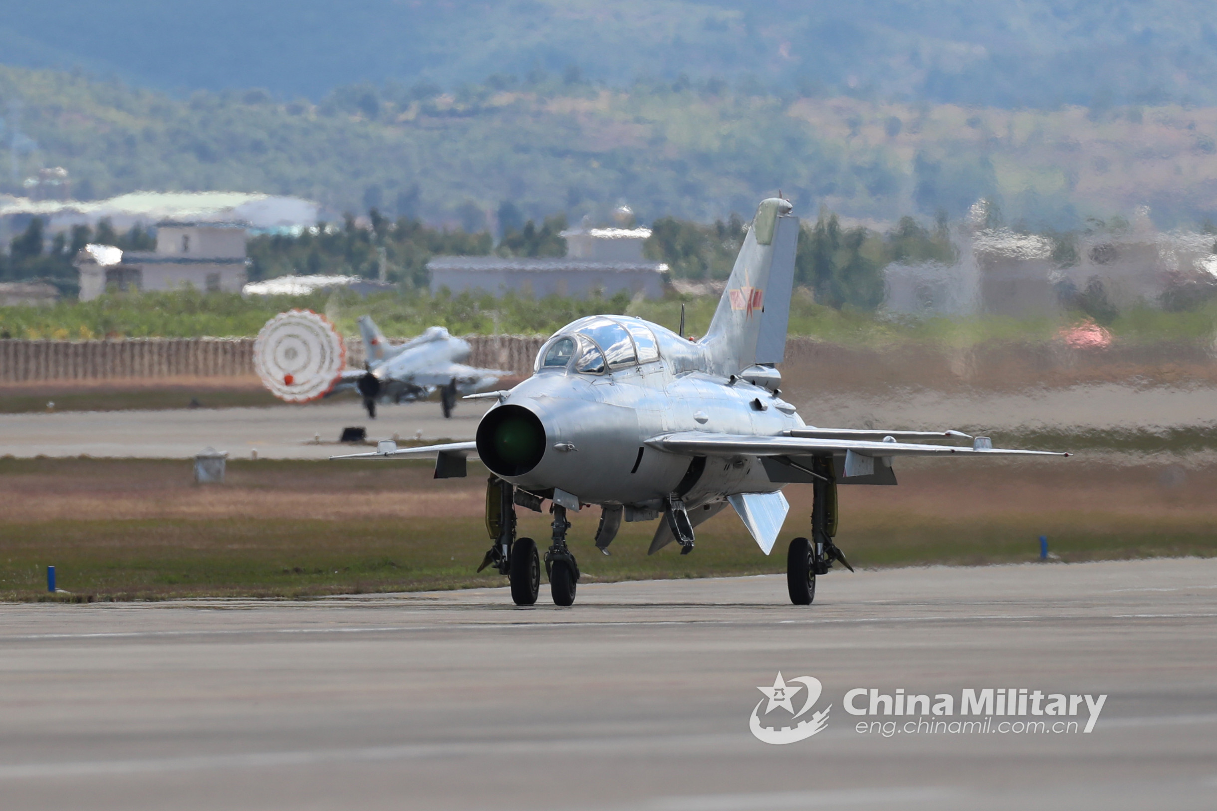 A J-7 fighter jet attached to an aviation brigade of the air force under the PLA Southern Theater Command taxies down the runway after landing during a flight training exercise on December 7, 2021. (eng.chinamil.com.cn/Photo by Huang Rongkai)