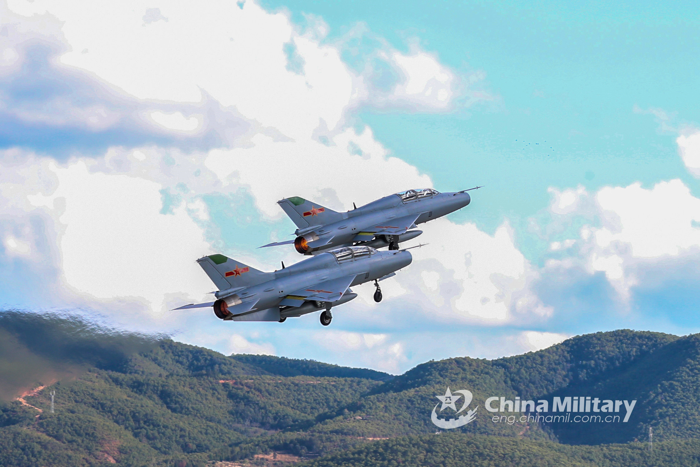 Two J-7 fighter jets attached to an aviation brigade of the air force under the PLA Southern Theater Command take off simultaneously for a flight training exercise on December 7, 2021. (eng.chinamil.com.cn/Photo by Huang Rongkai)