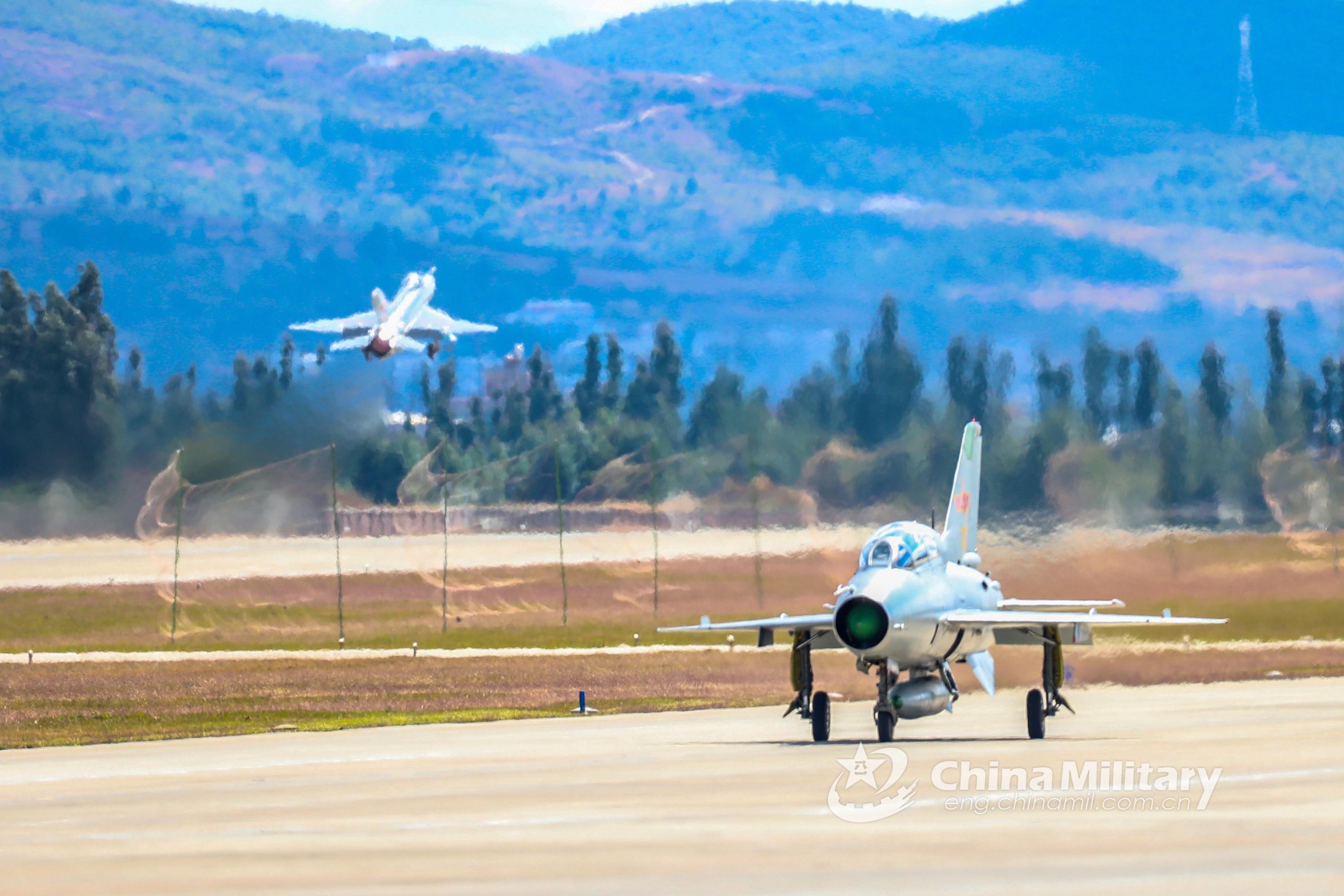 A J-7 fighter jet attached to an aviation brigade of the air force under the PLA Southern Theater Command taxies to the take-off point as another fighter takes off during a flight training exercise on December 7, 2021. (eng.chinamil.com.cn/Photo by Huang Rongkai)