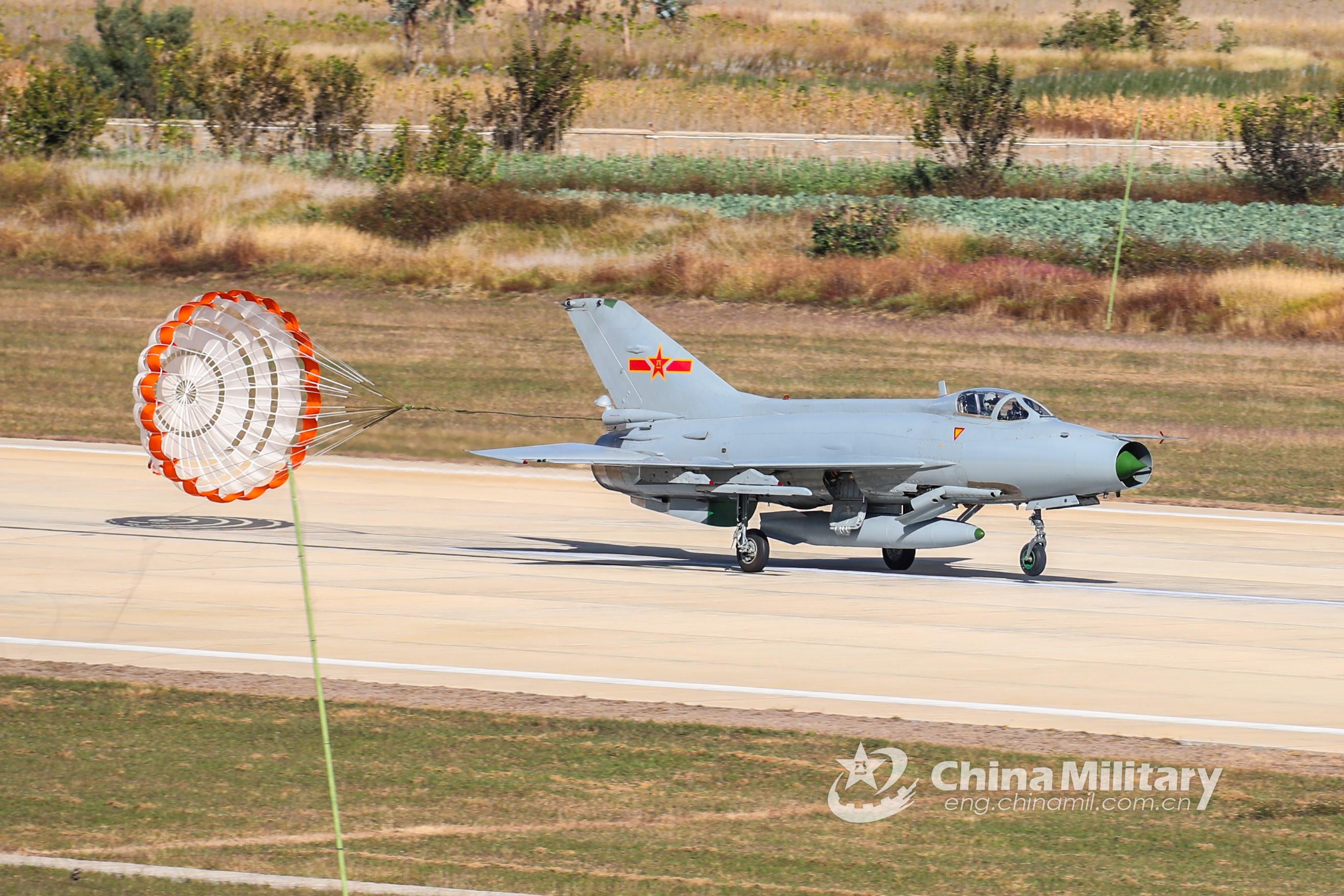 A J-7 fighter jet attached to an aviation brigade of the air force under the PLA Southern Theater Command deploys its drogue parachute after landing during a flight training exercise on December 7, 2021. (eng.chinamil.com.cn/Photo by Huang Rongkai)
