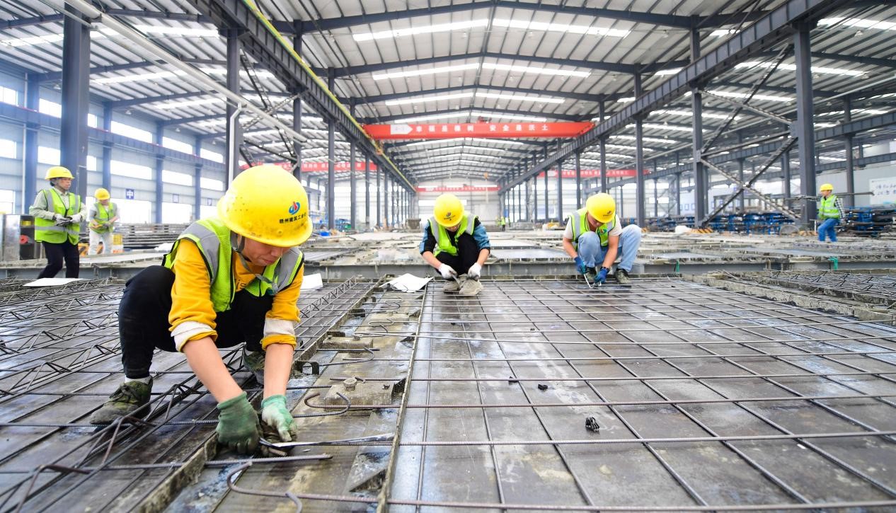 Constructors are busy with work at a prefabricated building workshop in Ganzhou city, east China’s Jiangxi province, Nov. 3, 2021. (People’s Daily Online/ Hu Jiangtao)?