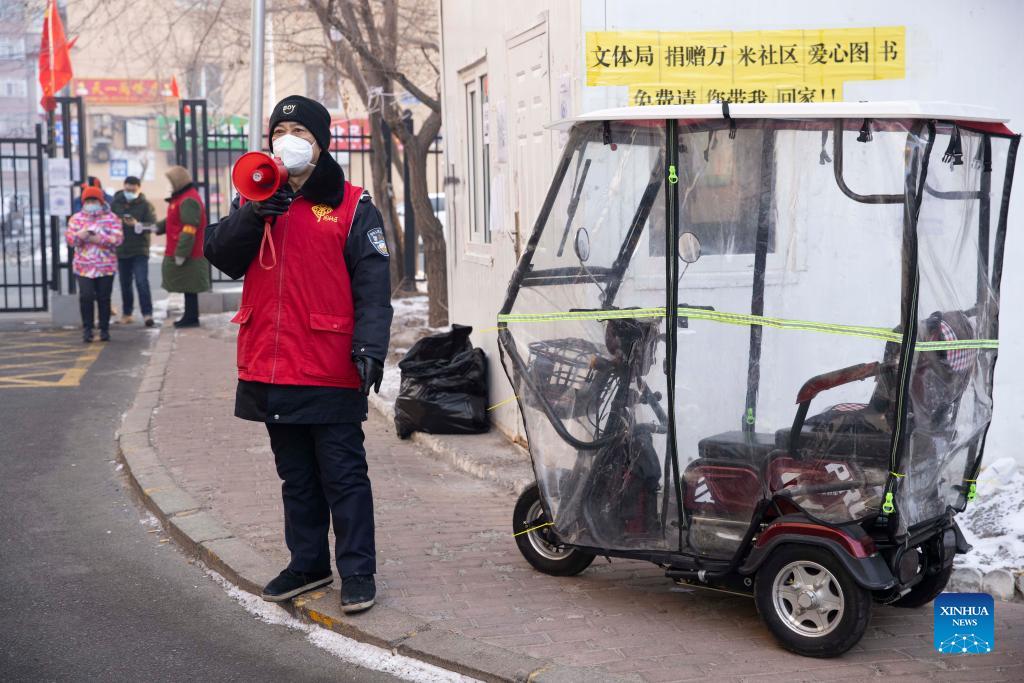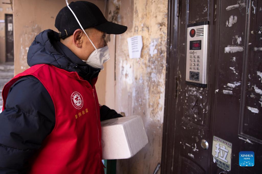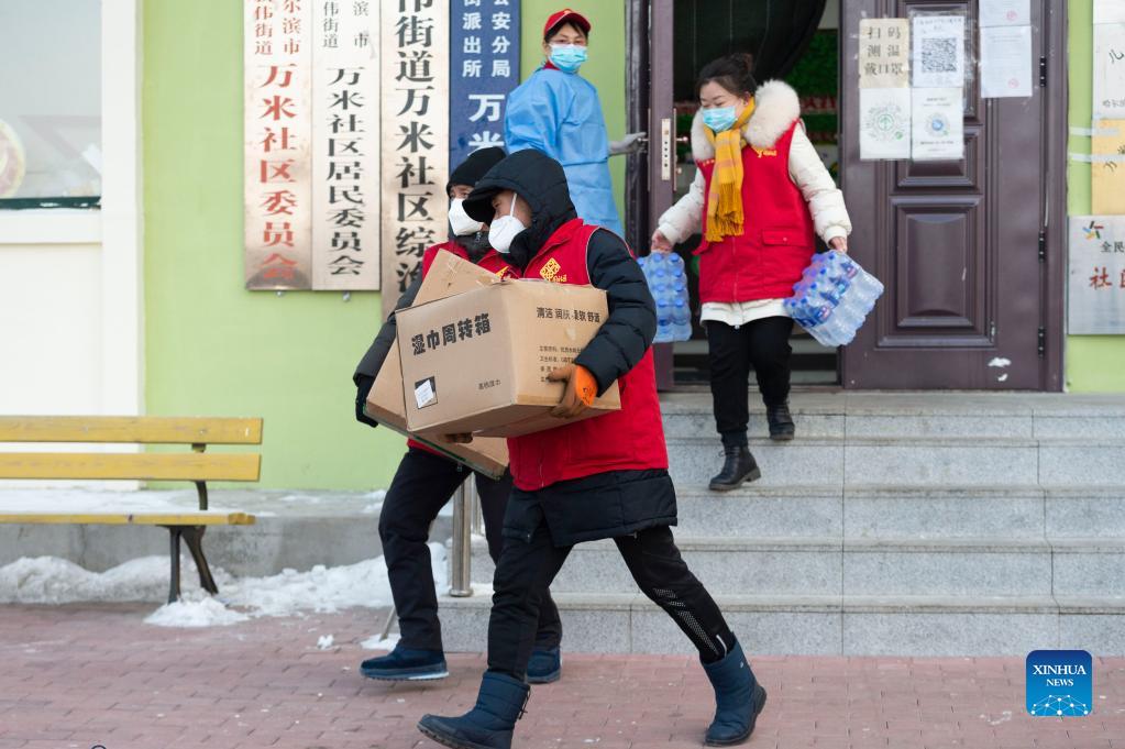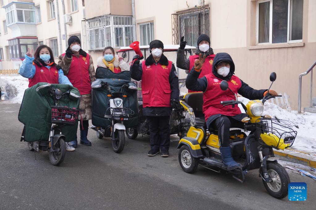 More than 20 volunteers dressed in red vests have shuttled back and forth on motorcycles to distribute necessary materials and help maintain order on site in Pingfang District of Harbin, northeast China's Heilongjiang Province. (Xinhua/Xie Jianfei)