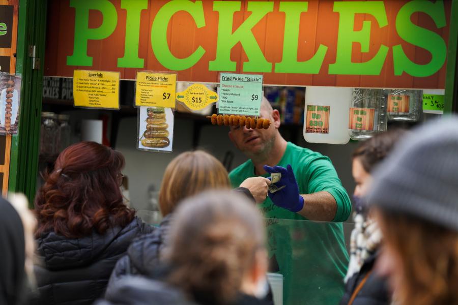 People buy food at a holiday market in New York, the United States, Dec. 7, 2021. (Xinhua/Wang Ying)