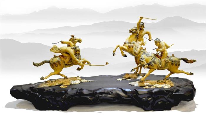 Photo shows an artwork created by Dai Deyu that features men in ancient times playing polo. (Photo/yangtse.com)