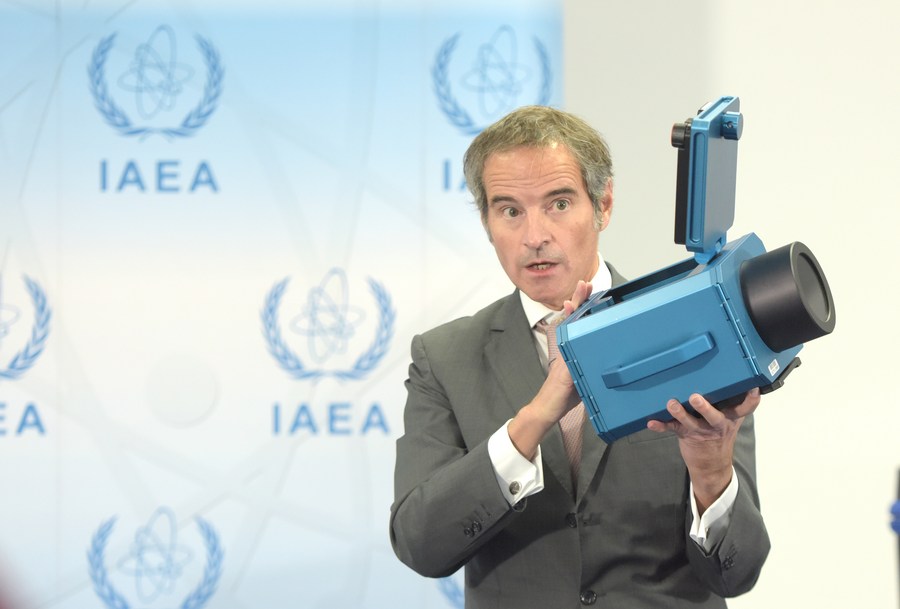 Rafael Mariano Grossi, Director General of the International Atomic Energy Agency (IAEA), displays a surveillance camera during a press conference in Vienna, Austria, Dec 17, 2021. (Xinhua/Guo Chen)