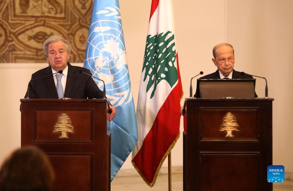 Lebanese President Michel Aoun (R) and visiting Secretary-General of the United Nations Antonio Guterres attend a joint press conference at Baabda Palace near Beirut, Lebanon, on Dec. 19, 2021. Guterres on Sunday urged the international community to increase its support for Lebanon, Lebanese TV station al-Jadeed reported. (Xinhua/Bilal Jawich)