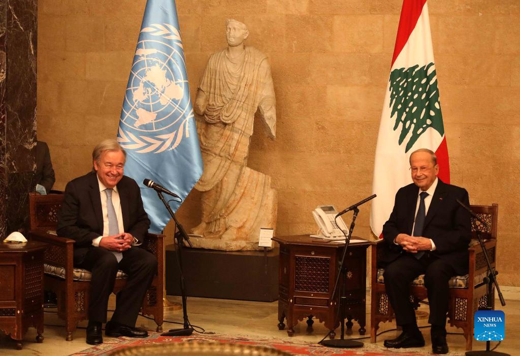 Lebanese President Michel Aoun (R) meets with visiting Secretary-General of the United Nations Antonio Guterres at Baabda Palace near Beirut, Lebanon, on Dec. 19, 2021. Guterres on Sunday urged the international community to increase its support for Lebanon, Lebanese TV station al-Jadeed reported. (Xinhua/Bilal Jawich)