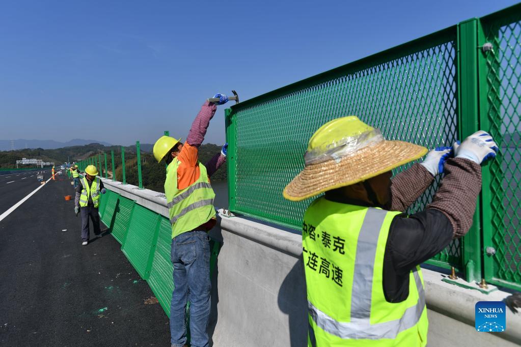 Workers install guardrails at the Beijiang grand bridge in Yingde City of Qingyuan, south China's Guangdong Province, Dec. 19, 2021. The Guangzhou-Lianzhou Expressway starts from Huadu District of Guangzhou and ends in Lianzhou City of Qingyuan, connecting with Yueyang-Linwu Expressway of Hunan. The main project will be opened to traffic by the end of 2021. After completion, it will further improve the inter-provincial corridor between Guangdong and Hunan and promote the integration of mountainous areas in northern Guangdong into the Guangdong-Hong Kong-Macao Greater Bay Area. (Xinhua/Liu Dawei)