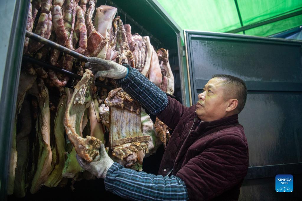 A staff member puts meat into a smokeless oven in Yubei District, southwest China's Chongqing Municipality, Dec. 18, 2021. Smoked meat is widely made and consumed by local people in Chongqing as a common preparation for the Spring Festival. A batch of smokeless ovens developed by environmental protection equipment enterprises have been set up in residential areas of Chongqing to help reduce air pollution during the making process of smoked meat. Air cleaning devices attached to the oven could highly reduce the concentration of particulate matter and oil smoke released by the oven. (Xinhua/Tang Yi)