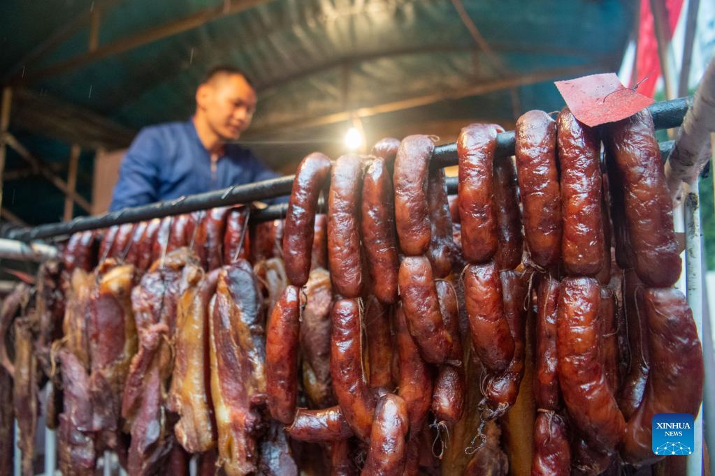 A staff member arranges smoked meat in Yubei District, southwest China's Chongqing Municipality, Dec. 18, 2021. Smoked meat is widely made and consumed by local people in Chongqing as a common preparation for the Spring Festival. A batch of smokeless ovens developed by environmental protection equipment enterprises have been set up in residential areas of Chongqing to help reduce air pollution during the making process of smoked meat. Air cleaning devices attached to the oven could highly reduce the concentration of particulate matter and oil smoke released by the oven. (Xinhua/Tang Yi)