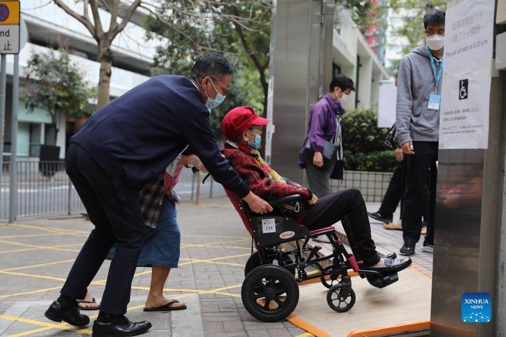 Voters enter a polling station to cast ballot in Wan Chai of Hong Kong, south China, Dec. 19, 2021. The election for the seventh-term Legislative Council (LegCo) of the Hong Kong Special Administrative Region (HKSAR) kicked off Sunday morning, the first since the improvement to the HKSAR electoral system. More than 600 polling stations opened at 8:30 a.m. local time (0030 GMT) across Hong Kong for about 4.5 million registered electors to cast their votes. (Xinhua/Wu Xiaochu)