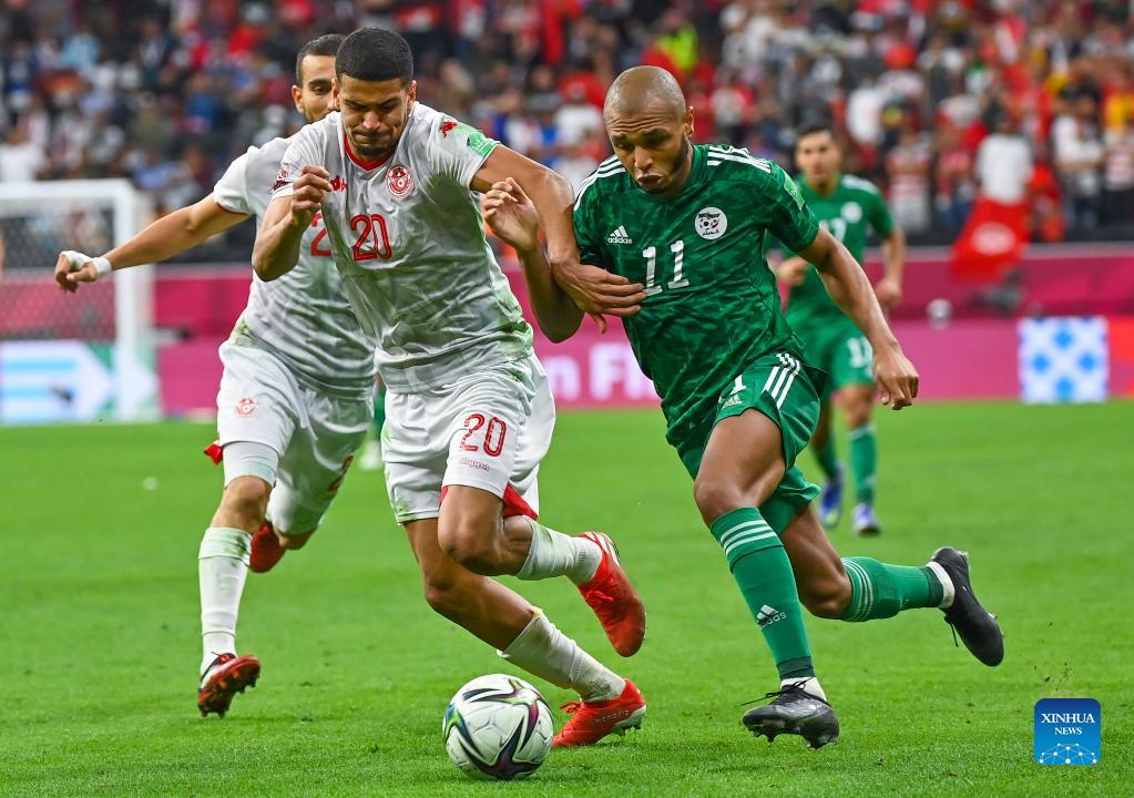 Brahimi Yacine (R) of Algeria vies with Drager Mohamed of Tunisia during the FIFA Arab Cup Qatar 2021 final match between Tunisia and Algeria at Al Bayt Stadium in Doha, Qatar, Dec. 18, 2021. (Photo by Nikku/Xinhua)