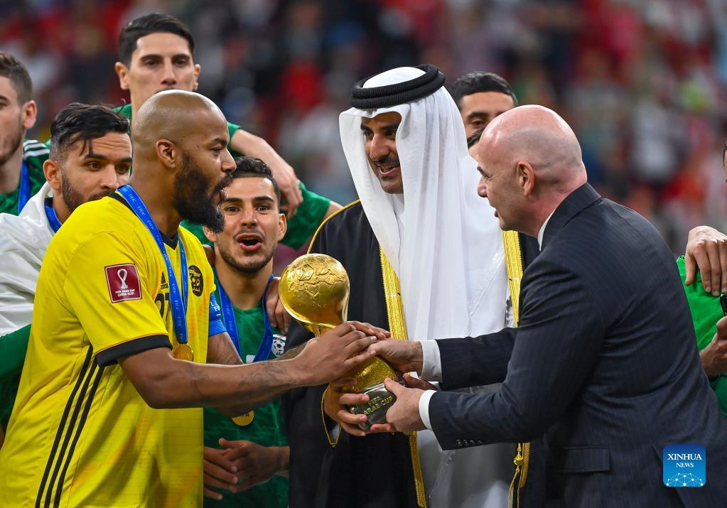 FIFA President Gianni Infantino (R) and Qatar's Emir Sheikh Tamim bin Hamad al-Thani (C) give the trophy to Algeria's captain Rais Mbolhi (L) after Algeria won the FIFA Arab Cup Qatar 2021 final match between Tunisia and Algeria at Al Bayt Stadium in Doha, Qatar, Dec. 18, 2021. (Photo by Nikku/Xinhua)
