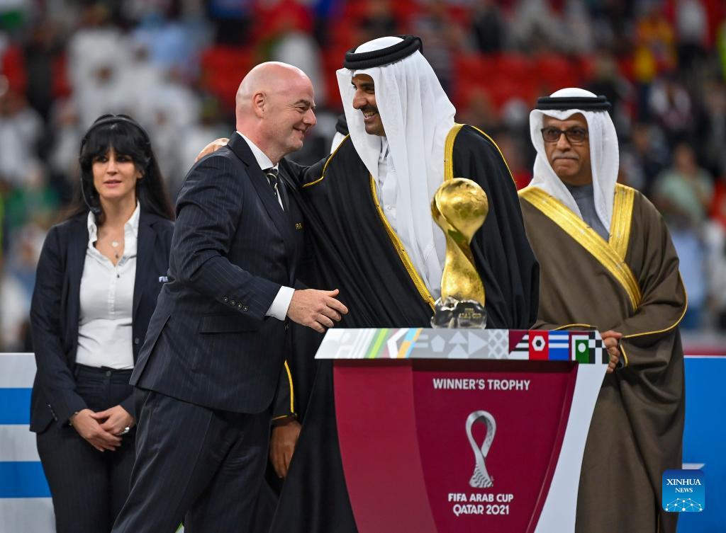 FIFA President Gianni Infantino (2nd L) speaks with Qatar's Emir Sheikh Tamim bin Hamad al-Thani (2nd R) ahead of presenting the trophy to the Algerian team after its winning the FIFA Arab Cup Qatar 2021 final match between Tunisia and Algeria at Al Bayt Stadium in Doha, Qatar, Dec. 18, 2021. (Photo by Nikku/Xinhua)