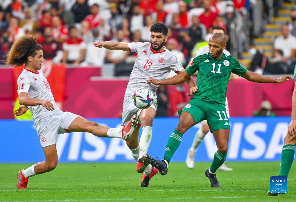 Brahimi Yacine of (R) Algeria vies with Sassi Ferjani (C) and Mejbri Hannibal of Tunisia during the FIFA Arab Cup Qatar 2021 final match between Tunisia and Algeria at Al Bayt Stadium in Doha, Qatar, Dec. 18, 2021. (Photo by Nikku/Xinhua)