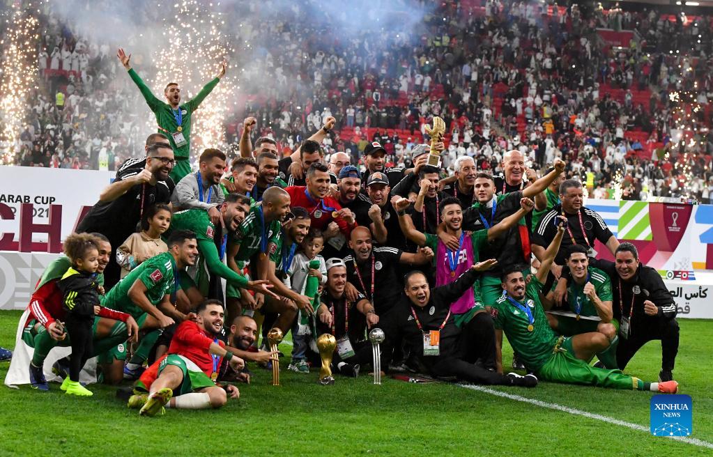 Players of Algeria celebrate with the trophy after winning the FIFA Arab Cup Qatar 2021 final match between Tunisia and Algeria at Al Bayt Stadium in Doha, Qatar, Dec. 18, 2021. (Photo by Nikku/Xinhua)