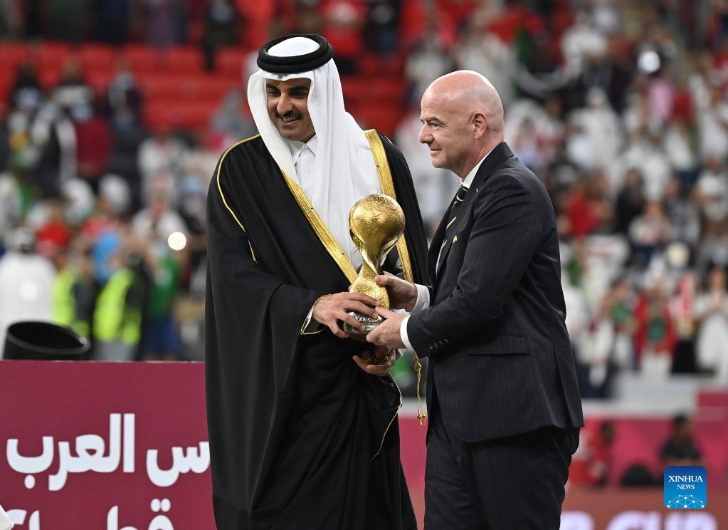 FIFA President Gianni Infantino (R) and Qatar's Emir Sheikh Tamim bin Hamad al-Thani prepare to present the trophy to the Algerian team after its winning the FIFA Arab Cup Qatar 2021 final match between Tunisia and Algeria at Al Bayt Stadium in Doha, Qatar, Dec. 18, 2021. (Photo by Nikku/Xinhua)