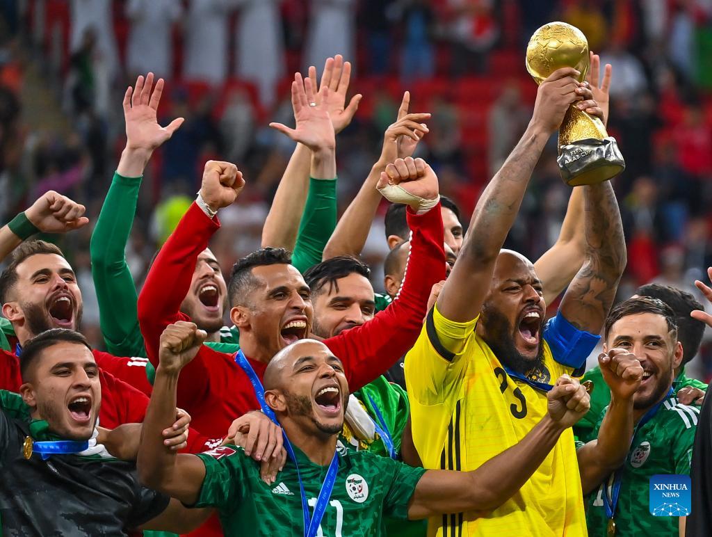 Players of Algeria celebrate with the trophy after winning the FIFA Arab Cup Qatar 2021 final match between Tunisia and Algeria at Al Bayt Stadium in Doha, Qatar, Dec. 18, 2021. (Photo by Nikku/Xinhua)