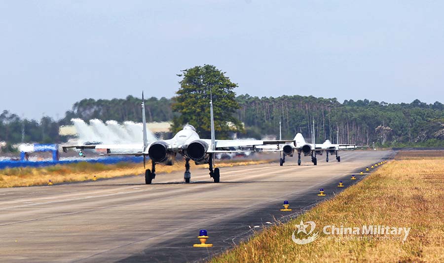 Fighter jets attached to a naval aviation brigade under the PLA Southern Theater Command participate in a close formation taxi known as an "elephant walk" during a flight training exercise on December 9, 2021. (eng.chinamil.com.cn/Photo by Deng Zeming)