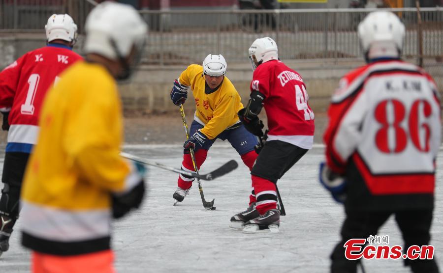 A team of hockey players competes at a park in Shenyang, northeast China's Liaoning Province, Dec. 20, 2021. (Photo: China News Service/Yu Haiyang)
