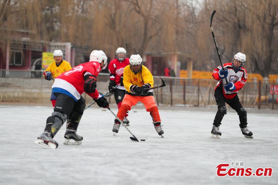 The hockey team, consisting of retired men who love winter sports, plays in the park every day. As the Beijing 2022 Olympic Games approach, winter sports are gaining more popularity in China.