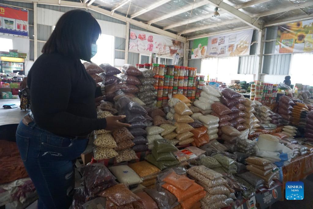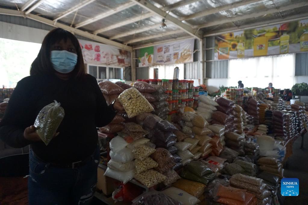 Maria Mukela, a food trader, shows dry foods at JCS Food Market in Lusaka, Zambia, on Dec. 18, 2021. Access to decent trading spaces is a challenge for many small-scale food traders in Zambia. It is for this reason that Jihai Central Sports (JCS) Company Limited, a Chinese-owned entity operating in Zambia, decided to empower local small-scale food traders in Lusaka with clean and affordable trading spaces. (Photo by Lillian Banda/Xinhua)