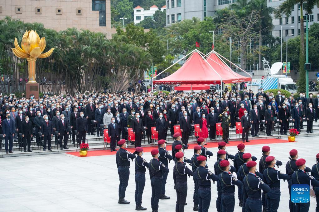 A flag-raising ceremony marking the 22nd anniversary of Macao's return to the motherland is held at the Golden Lotus Square in Macao, south China, Dec. 20, 2021. (Xinhua/Cheong Kam Ka)
