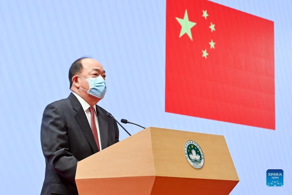 Ho Iat Seng, Chief Executive of the Macao Special Administrative Region (SAR), delivers a speech during a reception held by the Macao SAR government to mark the 22nd anniversary of Macao's return to the motherland at the China-Portuguese-speaking Countries Commercial and Trade Service Platform Complex in Macao, south China, Dec. 20, 2021. (Xinhua)