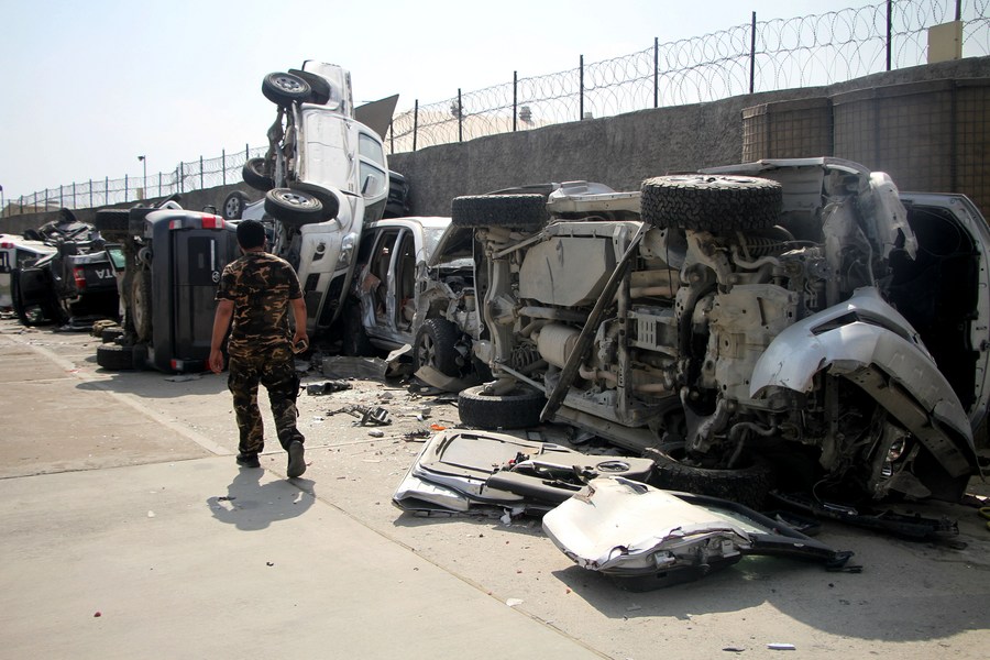 A Taliban member walks past damaged vehicles at the Kabul airport in Kabul, capital of Afghanistan, Sept. 20, 2021. The Kabul airport was damaged with its many facilities destroyed during the withdrawal of the last U.S.-led forces and U.S.-led evacuation flights in late August. (Photo by Saifurahman Safi/Xinhua)