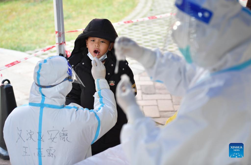 A medical worker collects a swab sample from a child at a COVID-19 testing site in Xi'an, northwest China's Shaanxi Province, Dec. 21, 2021. Xi'an launched a new round of all-inclusive nucleic acid testing on Tuesday since new locally transmitted confirmed COVID-19 cases were reported. (Xinhua/Shao Rui)
