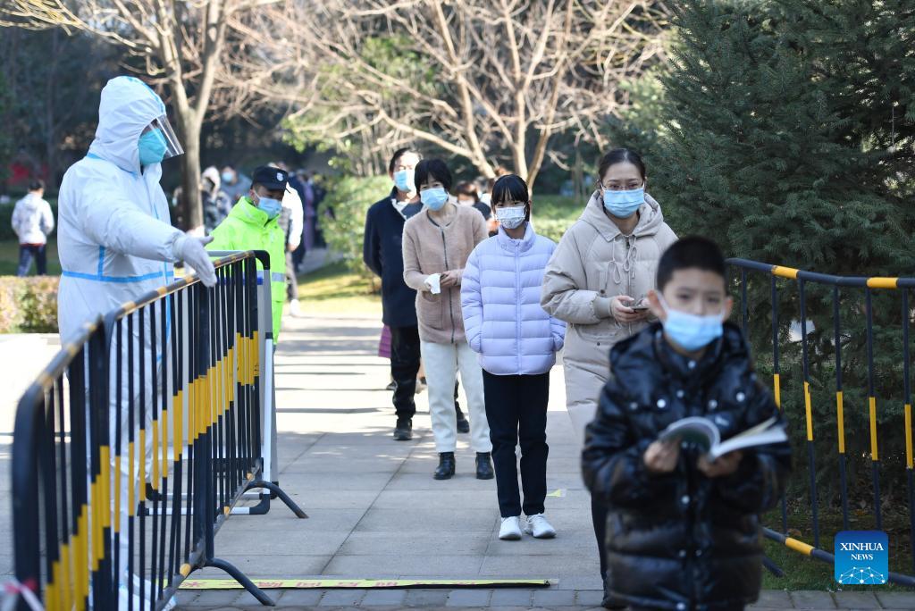 Residents queue up for nucleic acid test at a residential area in Xi'an, northwest China's Shaanxi Province, Dec. 21, 2021. Xi'an launched a new round of all-inclusive nucleic acid testing on Tuesday since new locally transmitted confirmed COVID-19 cases were reported. (Xinhua/Shao Rui)