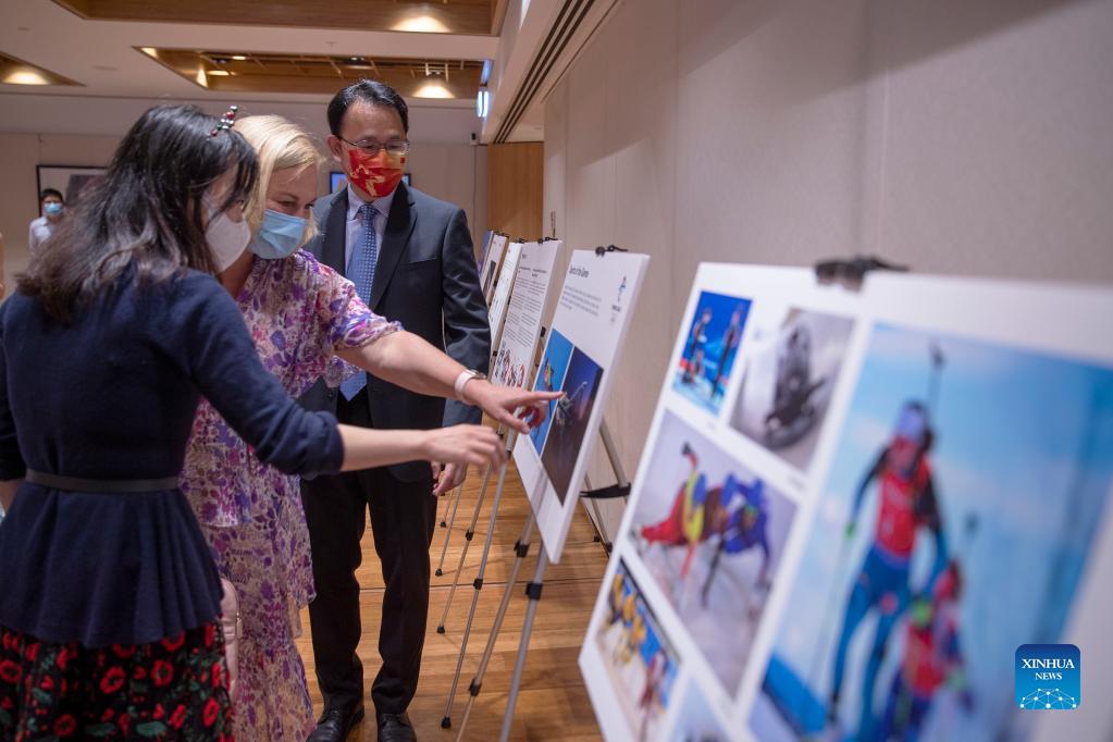 Phillipa Harrison (C), managing director of Tourism Australia, visits Beijing 2022 &Winter Travel around China Photography Exhibition at China Cultural Centre in Sydney, Australia, Dec. 21, 2021. (Xinhua/Bai Xuefei)
