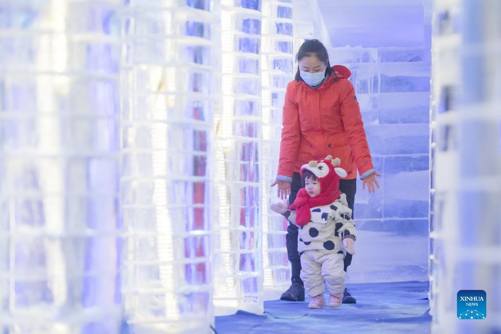 People visit an ice and snow art festival in Wuhan, capital of central China's Hubei Province, Dec. 21, 2021. As part of the 8th National Public Ice and Snow Season, the ice and snow art festival kicked off here on Tuesday. (Xinhua/Xiao Yijiu)