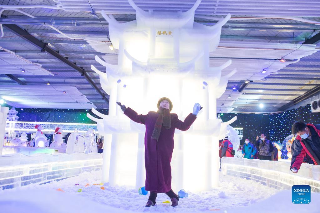 A visitor poses in front of an ice sculpture in the shape of Yellow Crane Tower, or Huanghelou, a landmark of the city of Wuhan, at an ice and snow art festival in Wuhan, capital of central China's Hubei Province, Dec. 21, 2021. As part of the 8th National Public Ice and Snow Season, the ice and snow art festival kicked off here on Tuesday. (Xinhua/Xiao Yijiu)
