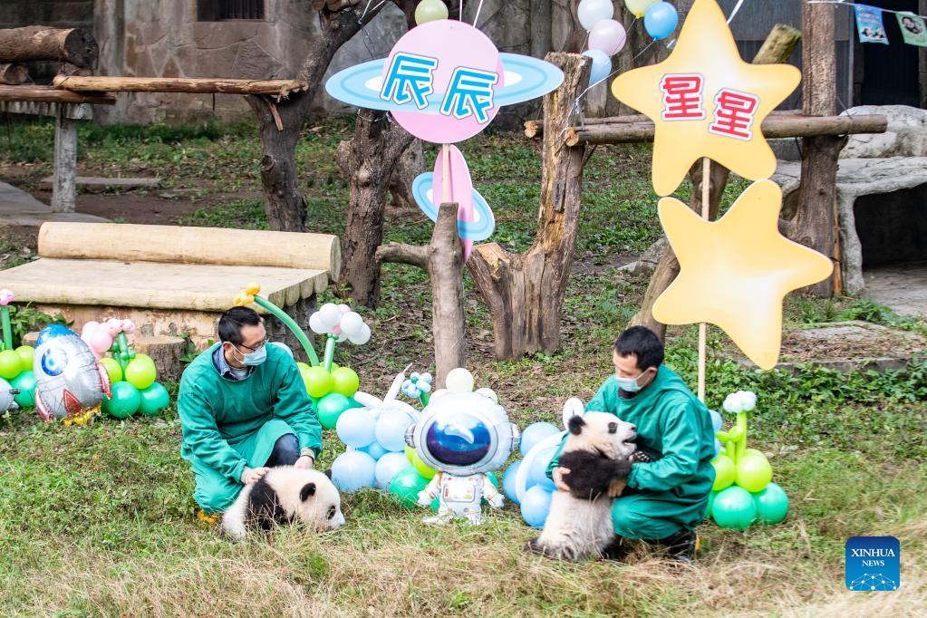 The giant panda twins "Xingxing" and "Chenchen" are seen at Chongqing Zoo in southwest China's Chongqing Municipality, Dec. 21, 2021. Chongqing Zoo held a naming ceremony for giant panda twins "Qizhen" and "Qibao", as well as "Xingxing" and "Chenchen" on Wednesday. Brother and sister panda twins "Qizhen" and "Qibao" were born in the zoo on Sept. 13, whose names together mean "precious babies." The other pair of panda twins, born on June 10, were named "Xingxing" and "Chenchen". (Xinhua/Tang Yi)