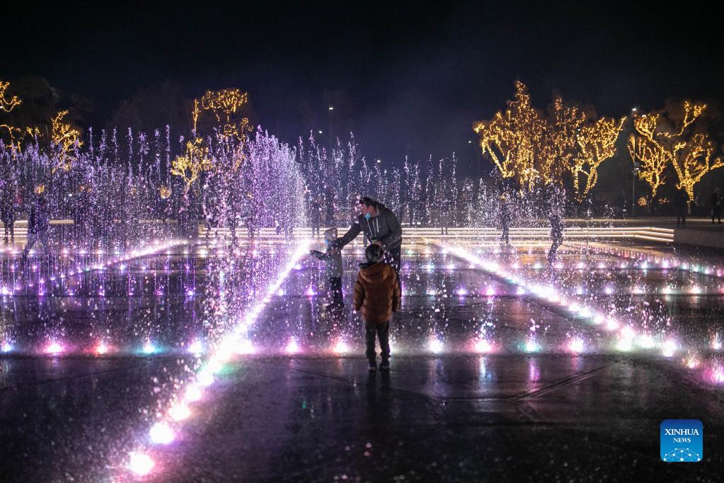 People stand around a fountain at the Experience Park in Elliniko in Athens, Greece, Dec. 20, 2021. The Experience Park opened to the public on Monday with decorations for the festive season. (Photo by Lefteris Partsalis/Xinhua)