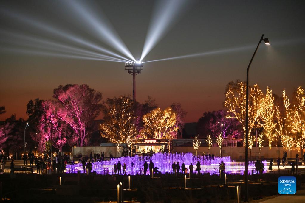 Photo taken on Dec. 20, 2021 shows silhouettes of visitors at the Experience Park in Elliniko in Athens, Greece. The Experience Park opened to the public on Monday with decorations for the festive season. (Photo by Lefteris Partsalis/Xinhua)