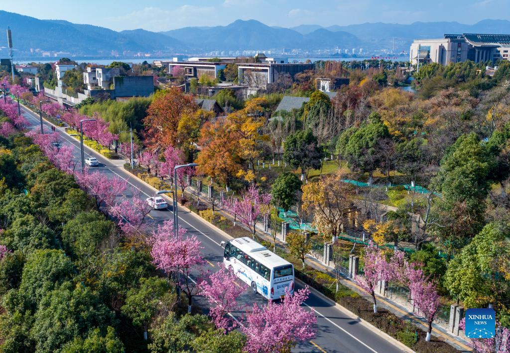 Photo taken on Dec. 21, 2021 shows cherry trees blooming along the streets in Kunming City, southwest China's Yunnan Province. (Xinhua/Chen Xinbo)