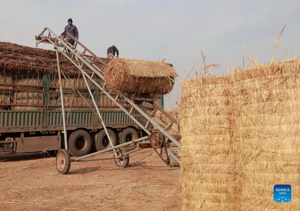Photo taken on Dec. 21, 2021 shows workers processing rice straw at a processing site in Xige Town, Fengnan district of Tangshan city, north China's Hebei Province. In recent years, local farmers have been guided to recycle straw. Straw previously used as firewood can be put to other uses, such as weaving or papermaking, or to produce organic fertilizer. Being more economical with the use of straw for recycling not only protects the environment, but helps increase farmers' income. (Xinhua/Yang Shiyao)