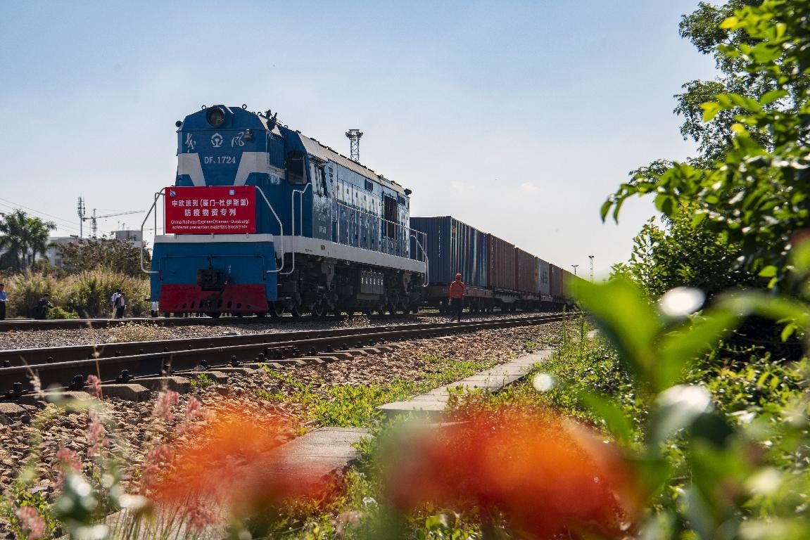 A China-Europe freight train loaded with anti-epidemic supplies is ready to depart from Haicang railway station in Xiamen city, southeast China’s Fujian province, April 21, 2021. (People’s Daily Online/Zhuang Jianhua)