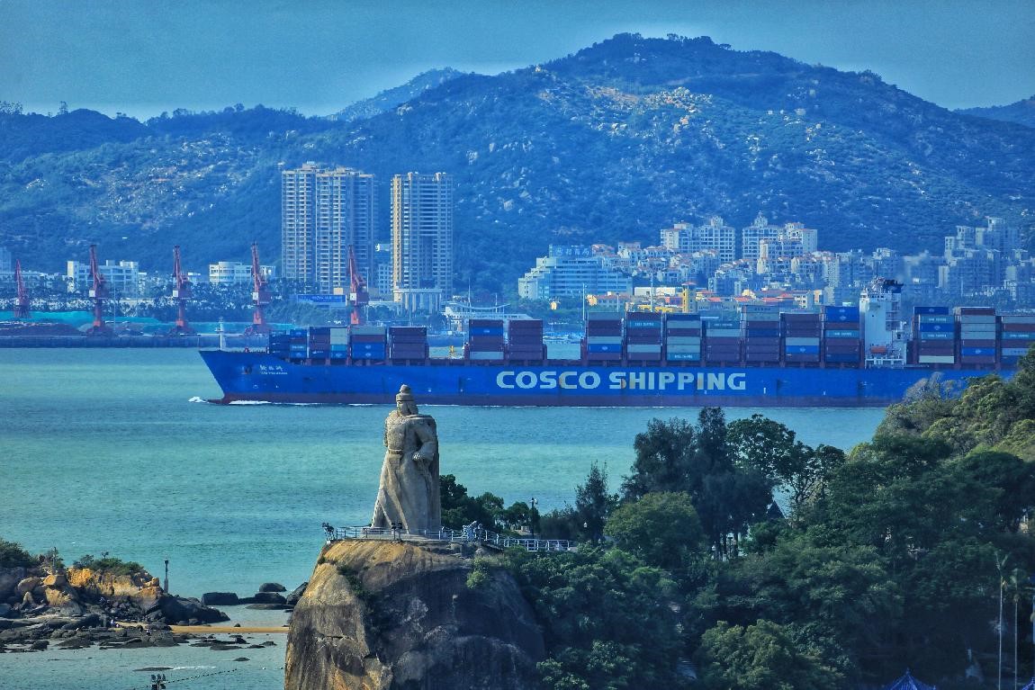 A cargo vessel sails near Gulangyu Island in Xiamen city, southeast China’s Fujian province. (People’s Daily Online/ Zhou Daoxian)
